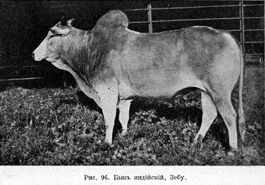 Представитель южно-азіатскаго рогатаго скота, съ короткой головой, висячими ушами, небольшими рожками, отвислой кожей на груди, горбообразнымъ возвышеніемъ на загривкѣ (основаннымъ на жировомъ перерожденіи мускуловъ), стройными ногами и бѣлесовато-пепельной окраской. Широко распространенный у себя на родинѣ этотъ индійскій быкъ является хорошимъ упряжнымъ и верховымъ животнымъ, выносливостью и быстротою бѣга мало уступающимъ обыкновенной лошади. Существующій во множествѣ породъ индійскiй зебу неизвѣстенъ въ дикомъ состояніи и, повидимому, представляетъ изъ себя лишь одомашненную форму, съ давнихъ поръ полученную черезъ прирученіе другого южно-азіатскаго быка (такъ называемаго бантенга, родоначальника и нѣкоторыхъ европейскихъ расъ рогатаго скота).