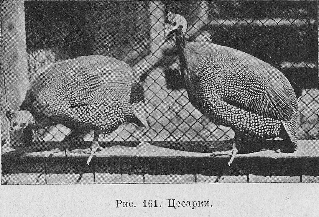 Нѣсколько особнякомъ отъ куръ стоять цесарки и индѣйки. Въ прирученномъ состояніи первыя (Numida meleagris, Рис. 90.1) давно извѣстны были и въ Европѣ, и на родинѣ ихъ, въ Африкѣ, гдѣ не большими стаями цесарки и понынѣ держатся въ умѣренно лѣсистыхъ мѣстностяхъ. Но приручаемыя съ легкостью цесарки никогда не оставляютъ свойственную имъ пугливость; это, вмѣстѣ съ ихъ сварливостью и непріятнымъ голосомъ, какъ и чрезмѣрная чувствительность ихъ къ холоду, удерживаетъ ихъ отъ болѣе широкаго распространенія. Вотъ почему за двухтысячелѣтнюю одомашненность этой птицы не получено того разнообразія породъ, которое извѣстно для домашнихъ куръ. Цесарки альбиноски и голубовато-пепельныя, съ крапинами менѣе замѣтными, чѣмъ у простыхъ цесарокъ — вотъ единственныя измѣненія, наблюдающіяся у нихъ въ неволѣ.