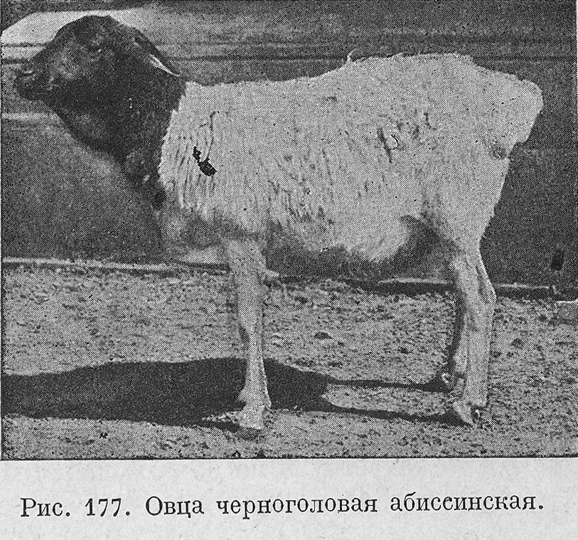 Какъ наиболѣе первобытную породу давняго туземнаго происхожденія слѣдуетъ отмѣтить африканскихъ дгиннохвостыхъ (Рис. 96.1) рыжей или черной масти, съ длиннымъ до земли хвостомъ, съ висячими ушами. Къ столь же первобытной расѣ нужно отнести овецъ черноголовыхъ абиссинскихъ, съ рѣзкимъ раздѣленіемъ окраски головы и тѣла (Рис. 96.2), съ слабо развитою шерстью и недоразвитымъ хвостомъ. Послѣдній окруженъ большою массой жира, отлагающагося на крестцѣ и образующаго надъ задними ногами такъ называемый «курдюкъ». Подобно многимъ первобытнымъ расамъ, африканская курдючная овца разводится не столько ради шерсти, рѣдкой и короткой, сколько ради мяса и въ особенности жира. Замѣняя жителямъ Востока запрещенное для нихъ свиное сало, этотъ жиръ овецъ въ высокой мѣрѣ облегчаетъ соблюденiе этого запрета. Вотъ почему курдючная овца достигла наибольшаго распространенiя у магометанъ, и, въ частности, среди киргизъ, калмыковъ и другихъ кочевниковъ. Отсюда и туземное названіе относящихся сюда породъ, какъ напр. овецъ чунтукскихъ (Рис. 96.3), у которыхъ отложеніе жира въ курдюкахъ порою достигаетъ пуда вѣса и даетъ возможность этимъ овцамъ лучше выносить періоды голода, расходовать запасы жира при безкормицѣ, возстановлять его при наступленіи хорошаго питанія. Легко переносящая жару и холодъ, способная къ огромнымъ переходамъ часто по безводнымъ мѣстностямъ, покрытымъ скудною травой настоящая курдючная овца — незамѣнимое домашнее животное кочевниковъ.