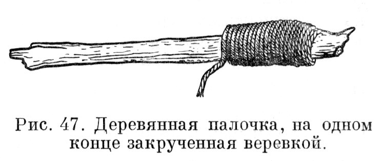 В оп. 136 (Табл. A.47) также дается деревянная палка, но она может быть успешно употреблена только одним концом (достаточно длинным для проталкивания свертка); второй конец так короток ввиду спутанности ее оборотами веревки, что им нельзя достать сверток.