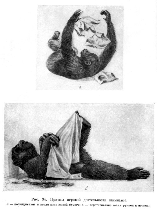 В частности, к такому же роду деятельности, направленной на сохранение развлекающего предмета, мы относим такие действия шимпанзе, как накладывание им себе на голову, на шею, или на спину хвойных веток, куска ткани. У В. Кёлера (на Тенерифе) шимпанзе накладывали на себя апельсинные корки, тряпки, шнуры, цепи, бумаги и старались их сохранить при переходе с места на место. В подобных случаях, наложив на себя предмет, шимпанзе Парис шел обычно медленно, осторожно, явно боясь сделать резкое движение, чтобы не уронить этот предмет, стараясь донести его до своего гнездового угла. Когда же обезьяна роняла переносимый предмет, то она немедленно поднимала его. Но когда Парис, положив на себя предмет, ронял его, сидя в гнезде, он обычно не спешил его поднять, особенно когда предмет падал близко и не выходил из поля зрения обезьяны.
