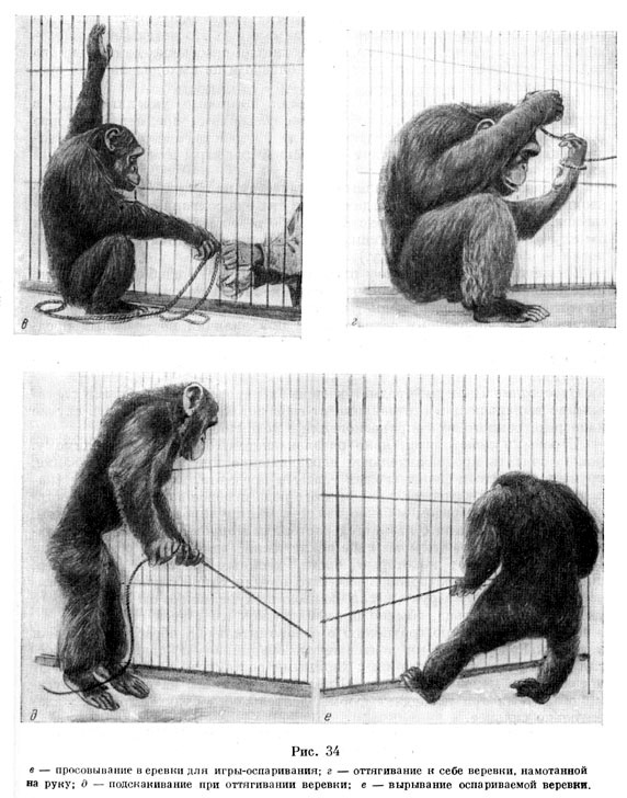 Эта последняя особенность поведения шимпанзе укрепляет нас в мысли, что навешивание на себя этими обезьянами предметов, которое В. Кёлер рассматривает как «украшения» [103] , в действительности обеспечивает сохранение обезьянами при себе вещей для игры и всякого рода манипулирования с ними.