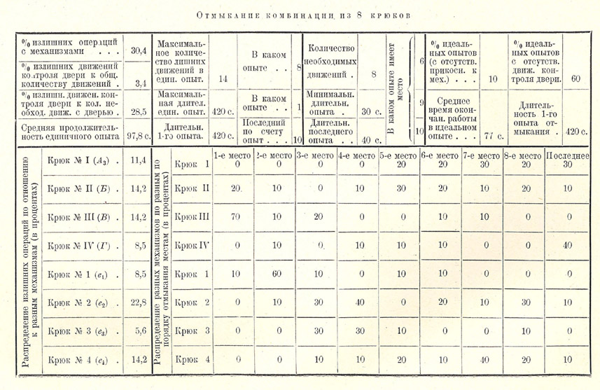 Время завершения работы с 10 крюками (равное 96 сек.) не приходится брать в точный расчет ввиду единичности опыта, но все же сравнительная краткость оперирования может быть объяснена упражнением и предшествующими навыками в отмыкании комбинации из 6—8—9 крюков.