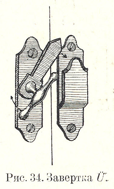 Предлагаются для преодоления запоры более осложненного, по сравнению с предыдущими, типа: завертки U и Ü, требующие при отмыкании их более сложного движения — вращения (то слева направо — по часовой стрелке на 90º, то справа налево — против часовой стрелки) (Фото 2.1, фиг. 3, 4; Рис. 1.32, Рис. 1.33).