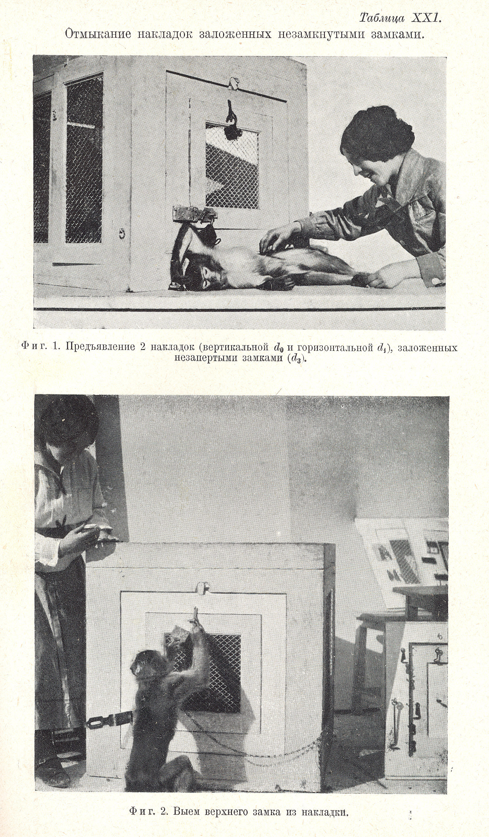 Это означает, что обезьяна не обладает точными двигательными навыками не только в отношении видоизмененных механизмов, но и в отношении уже знакомых, представленных в комбинации; она не применяет сразу точный способ действия и не ограничивается необходимым количеством движений, а еще экспериментирует там, где должна была бы знать и уметь. Она соразмеряет количество движений и согласует способ действия с потребными для цели отмыкания лишь в результате пробных опытов, но она злоупотребляет этим экспериментированием — оно заменяет ей недостаток точного запоминания прежних привычных действий и отсутствие сообразительности для выполнения действий видоизмененных и новых.