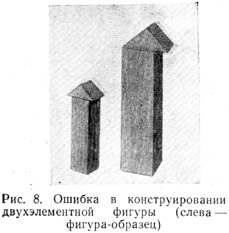 Более успешно были исправлены ошибки в репродуцировании образцов, где нижним элементом был цилиндр, верхним — четырехгранная призма; в последующих опытах та же задача была решена совершенно правильно. Это указывало на благоприятную роль повторения в совершенствовании конструирования и в исправлении ранее ошибочно конструируемых фигур.
