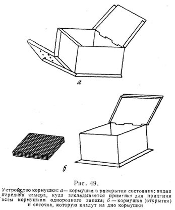 Маленькие коробочки не имели передней камеры. Для придания им общего запаха приманки плоские кусочки клались на дно каждой кормушки и покрывались проволочной сеткой (см. Рис. 2.1, б). Настоящая приманка закладывалась поверх сеточки.